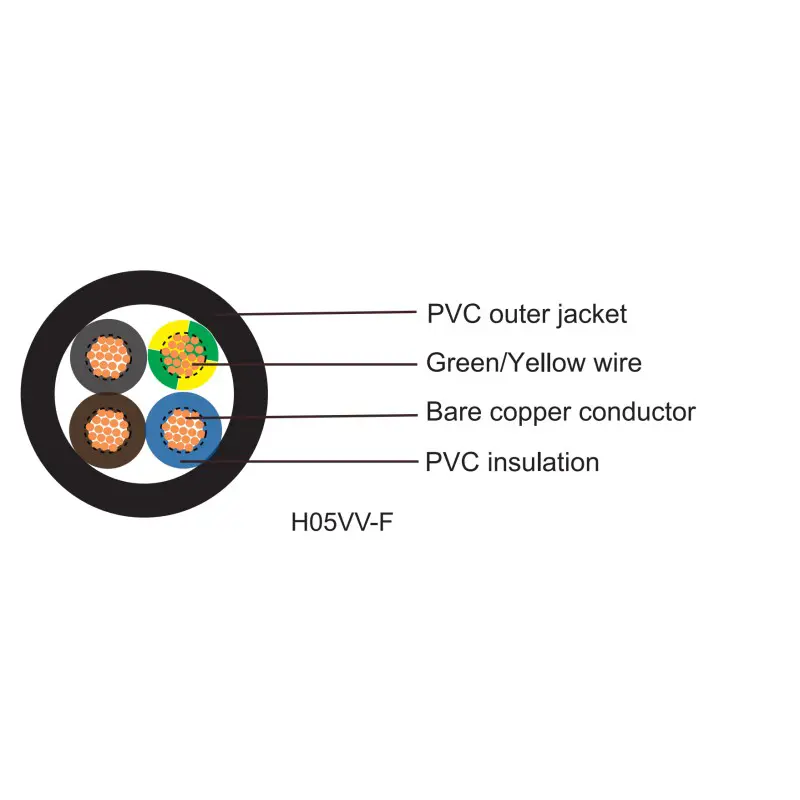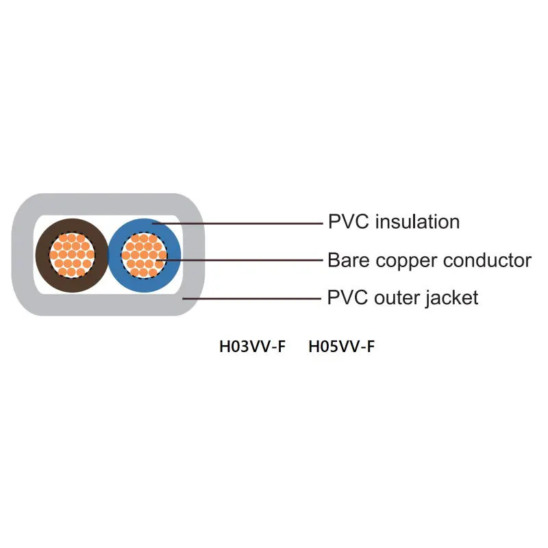 H05VV-F, H05VVH2-F, H03VV-F, H03VVH2-F składają się z cienkich przewodników miedzianych klasy 5, izolacji i powłoki z bezołowiowego PVC.